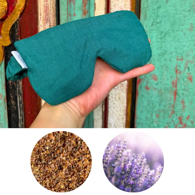 Opaska na oczy Amber Blindfold powstała jako uzupełnienie woreczków na oczy Amber Joga. Wypełniona jest solą nieoszlifowanymi bursztynami i lawendą, mocowana na elastycznej gumce obszytej tkaniną. Zakrywa w pełni oczy oraz część czoła i zatok przynosowych.