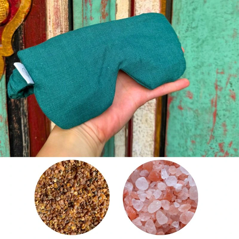 Kompres na oczy Amber Mask powstała jako uzupełnienie woreczków na oczy Amber Joga. Wypełniony jest solą kłodawską i nieoszlifowanymi bursztynami, mocowana na elastycznej gumce obszytej tkaniną. Zakrywa w pełni oczy oraz część czoła i zatok przynosowych.